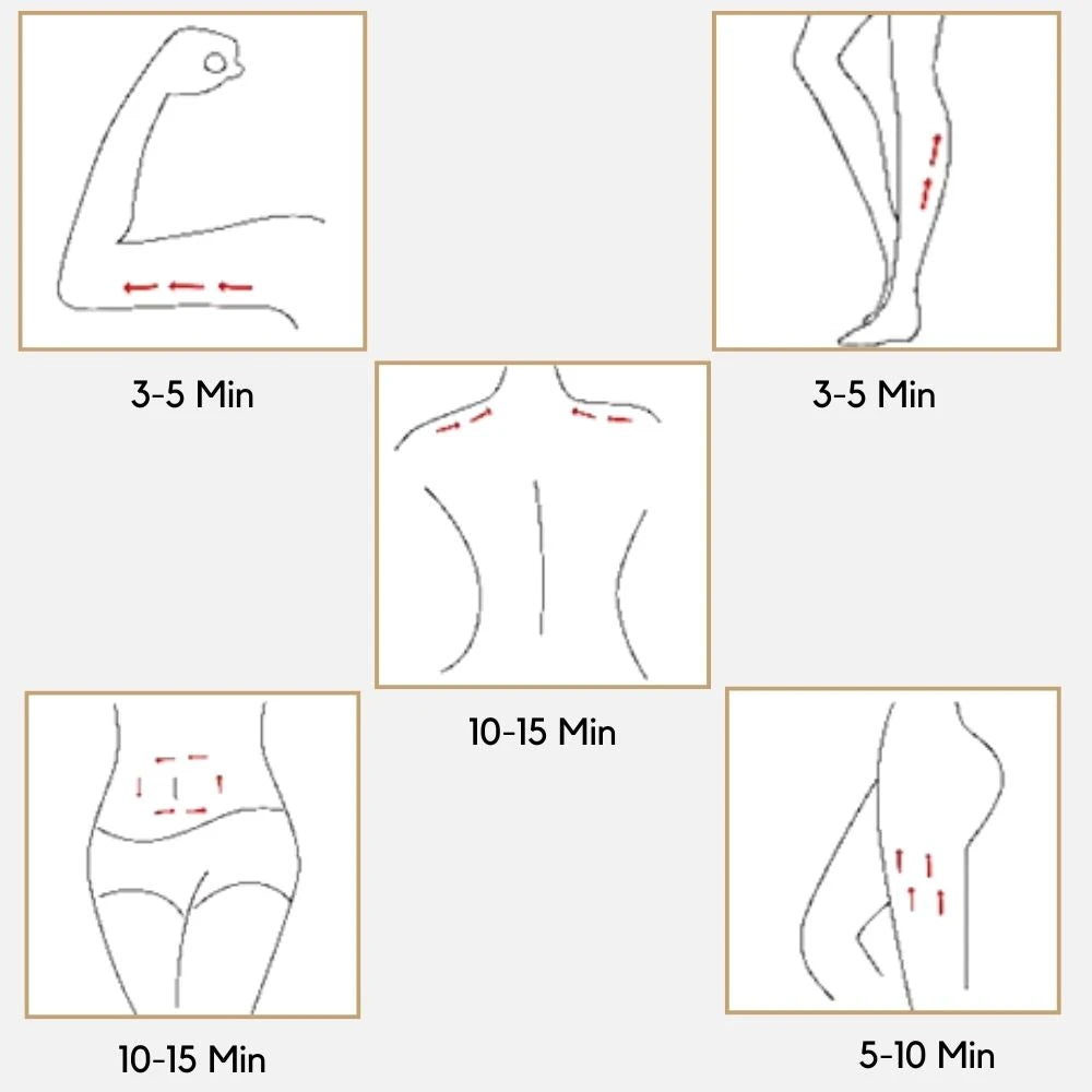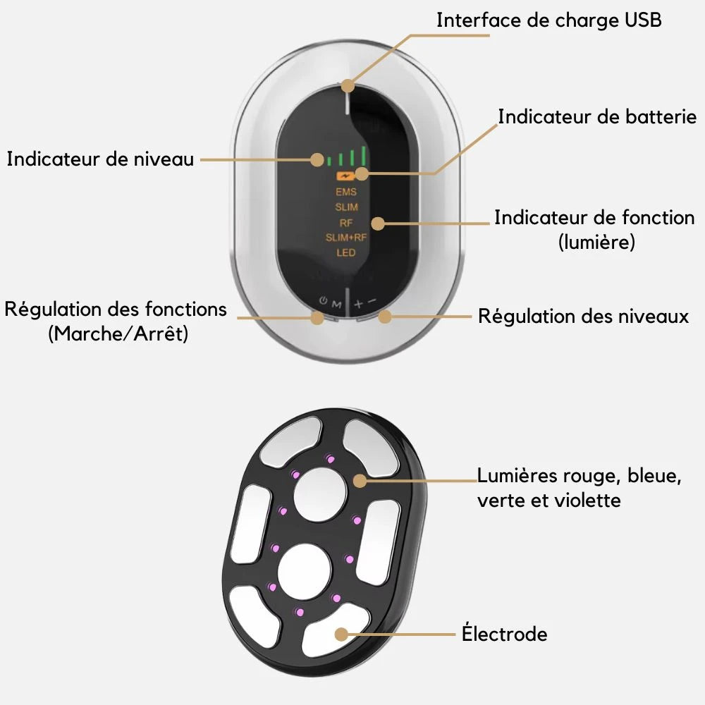 - Utilisation : Passez l’appareil sur les zones ciblées (ventre, cuisses, bras).