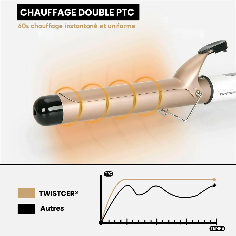 Le double chauffage PTC du TwistCer® offre un temps de chauffe ultra-rapide et une répartition homogène de la chaleur. Chaque mèche est parfaitement définie grâce à une température stable, garantissant des boucles durables sans risquer d’abîmer vos cheveux.