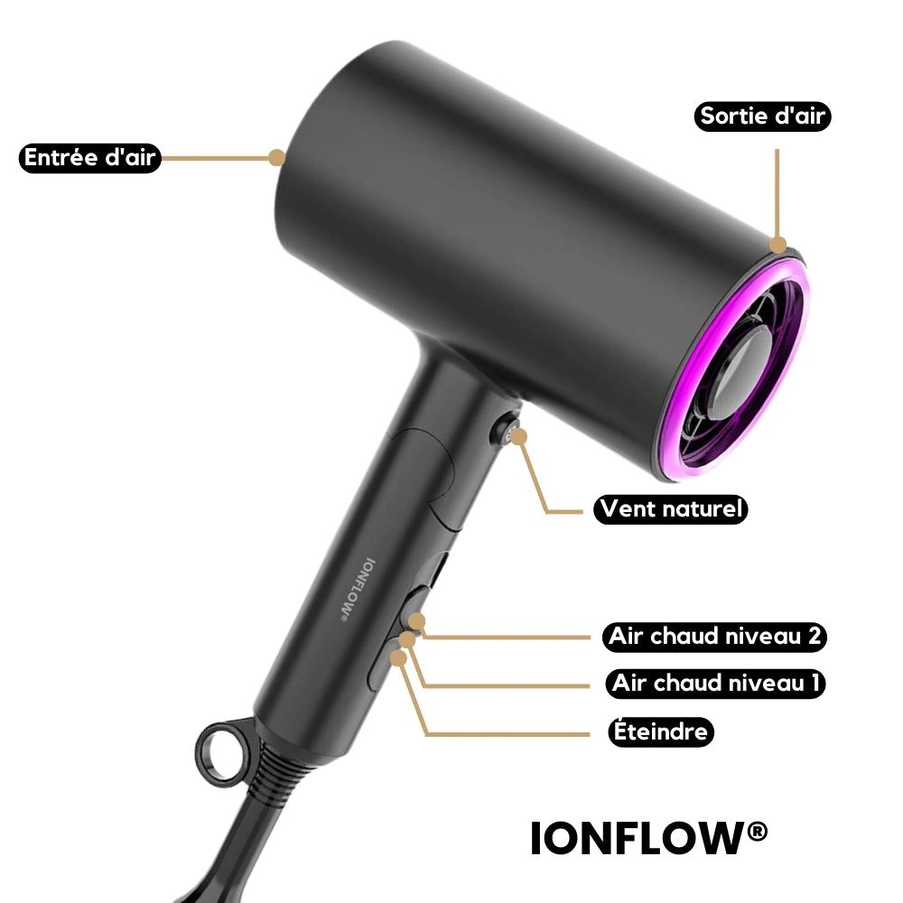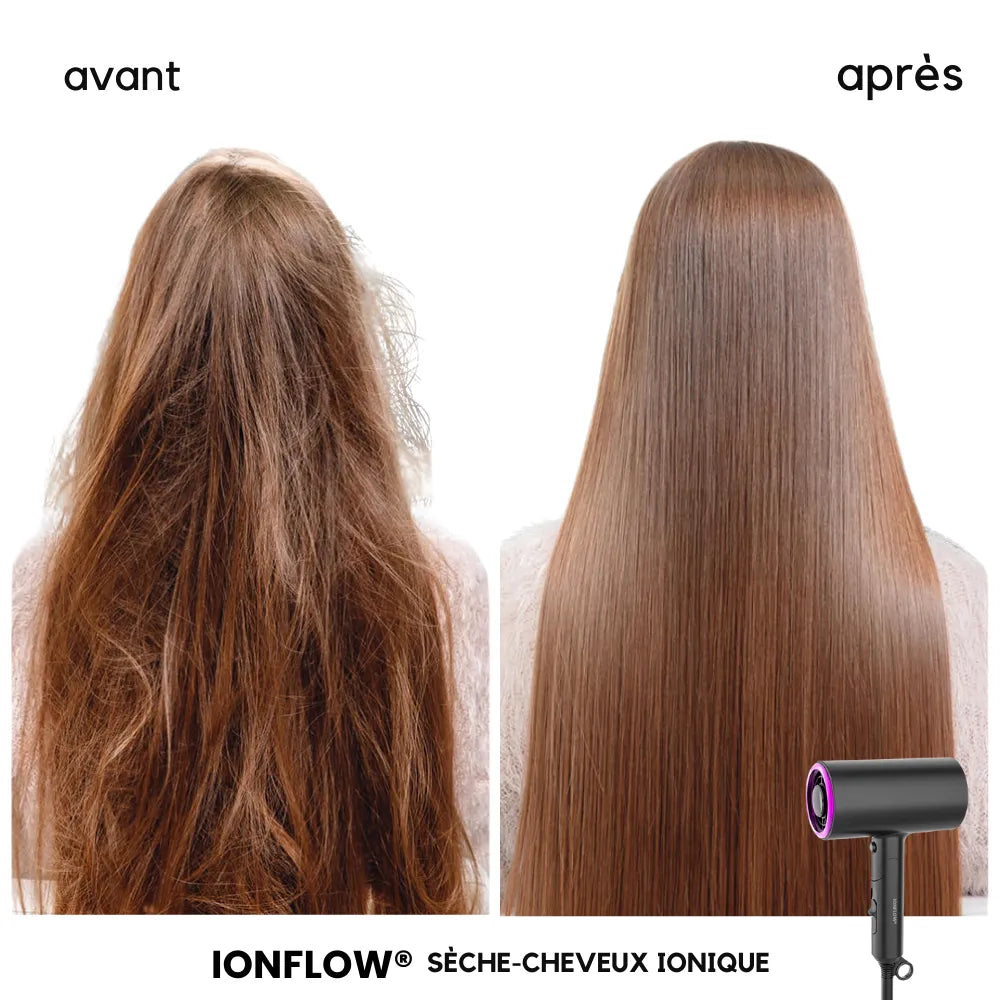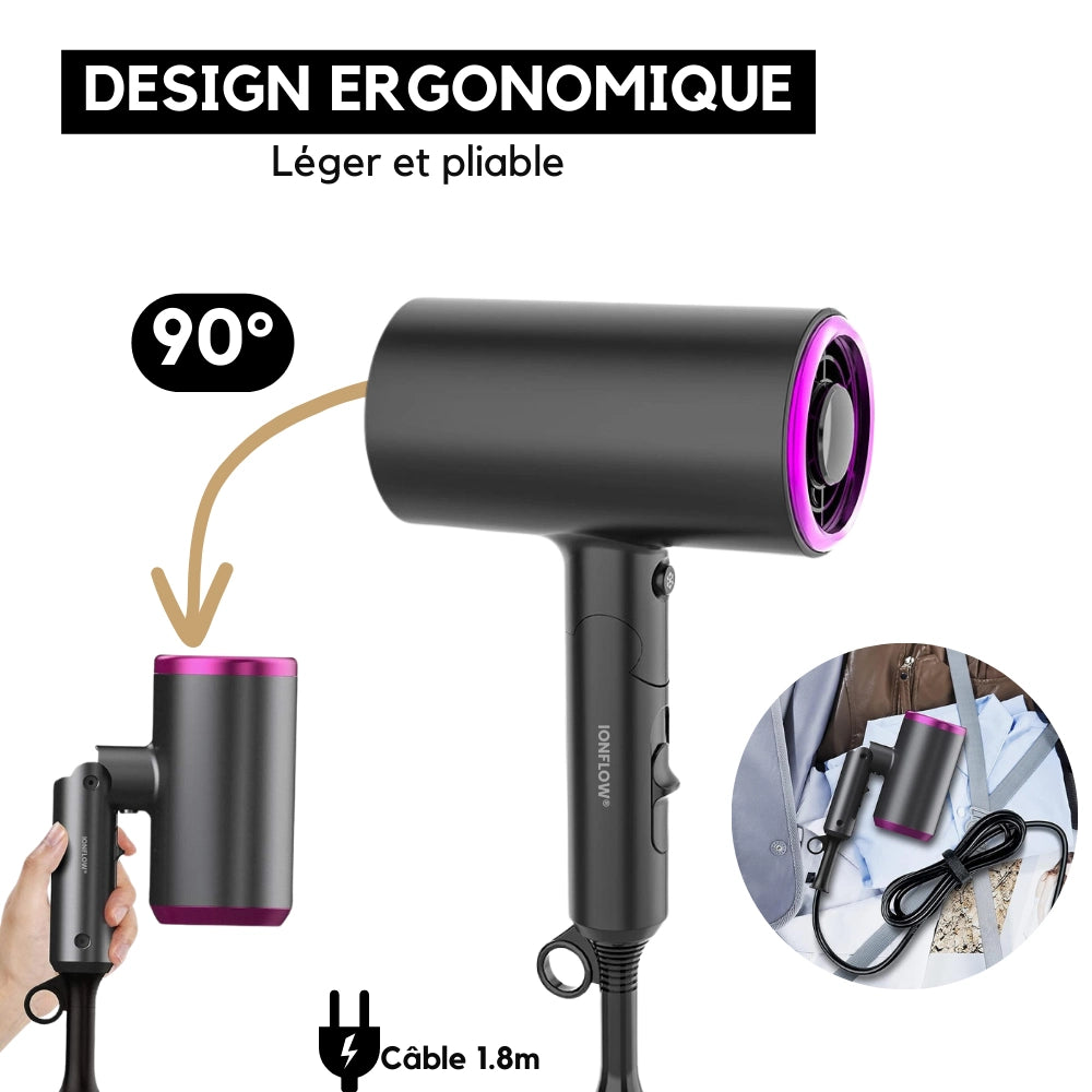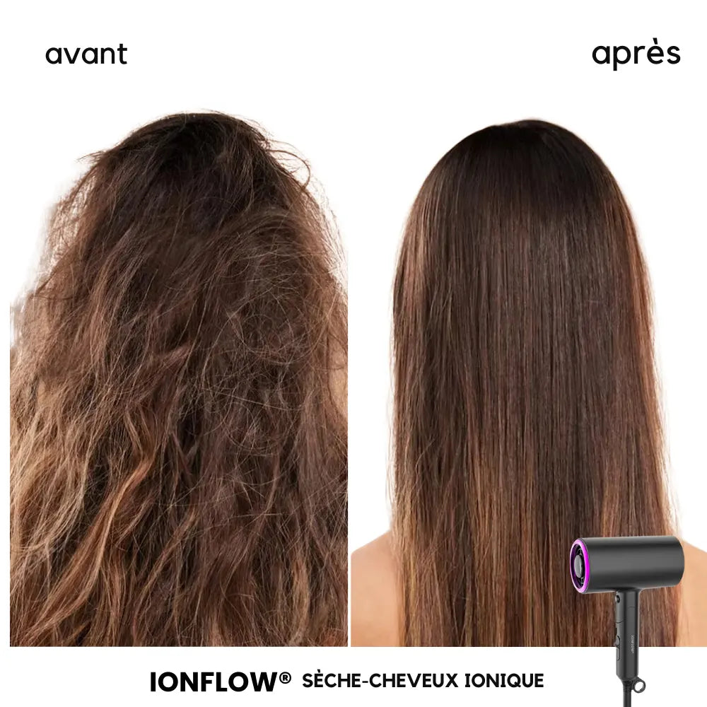 Découvrez le Sèche-Cheveux Ionique - IonFlow®, conçu pour offrir un séchage rapide et efficace grâce à sa puissance maximale de 1800W. La technologie ionique réduit les frisottis et l'électricité statique, laissant vos cheveux lisses, brillants et en bonne santé. Son design compact assurant une coiffure professionnel.