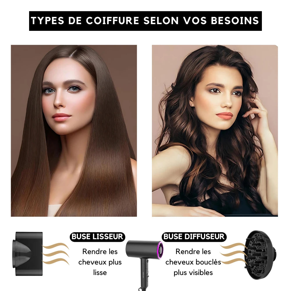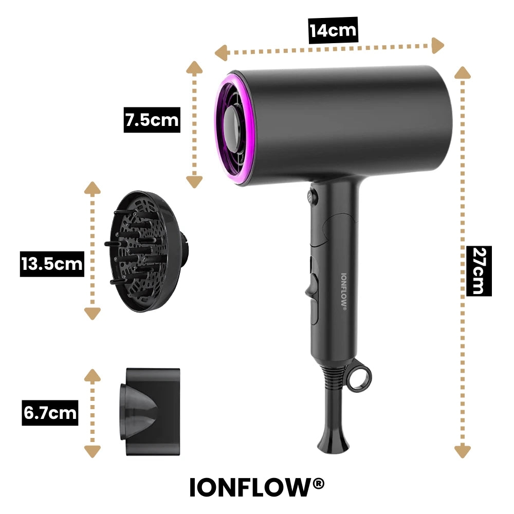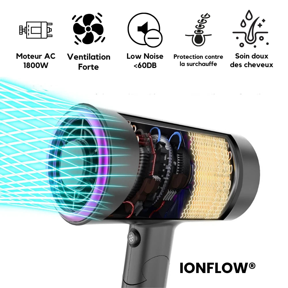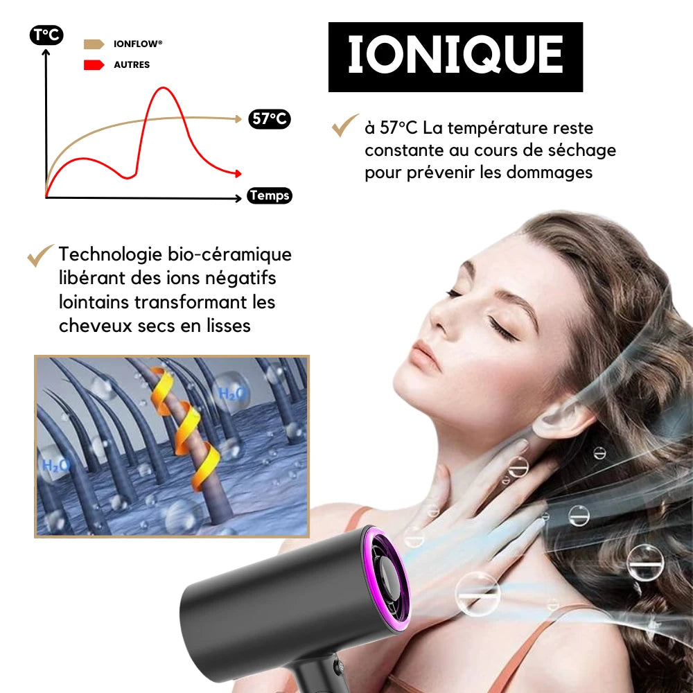 Découvrez le Sèche-Cheveux Ionique - IonFlow®, conçu pour offrir un séchage rapide et efficace grâce à sa puissance maximale de 1800W. La technologie ionique réduit les frisottis et l'électricité statique, laissant vos cheveux lisses, brillants et en bonne santé. Son design compact assurant une coiffure professionnel.